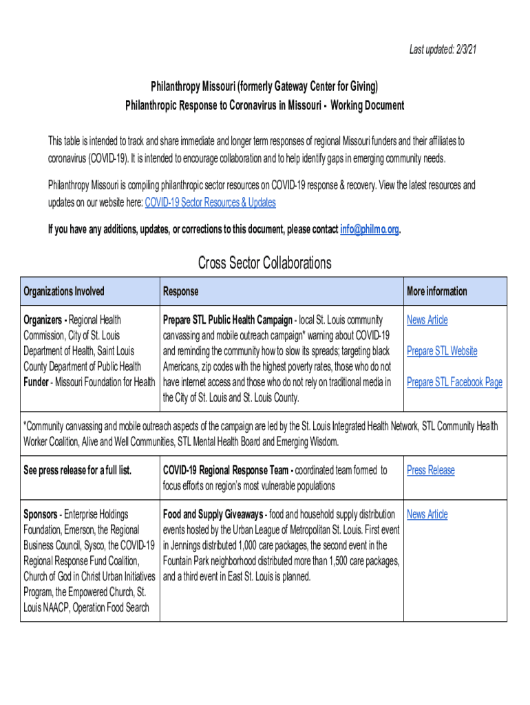 Last updated: 2/3/21Philanthropy Missouri (formerly Gateway Center for Giving) Philanthropic Response to Coronavirus in Missouri Working Document This table is intended to track and share immediate