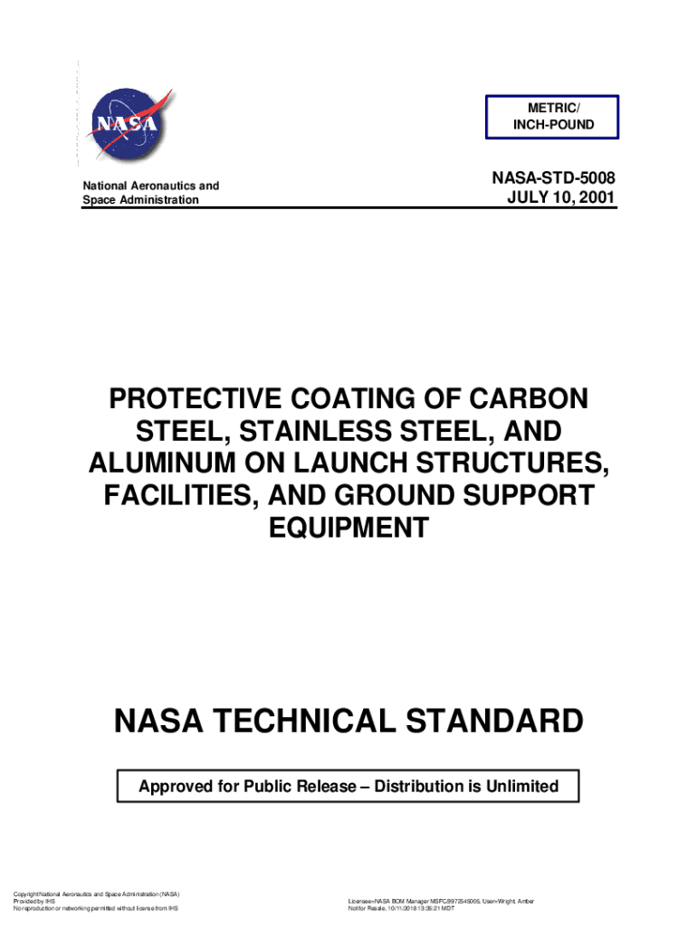 , ,, ,, ,,,, ,,,,, ,, ,,, ,, METRIC/ INCHPOUNDNational Aeronautics and Space AdministrationNASASTD5008 JULY 10, 2001PROTECTIVE COATING OF CARBON STEEL, STAINLESS STEEL, AND ALUMINUM ON LAUNCH STRUCTURES,