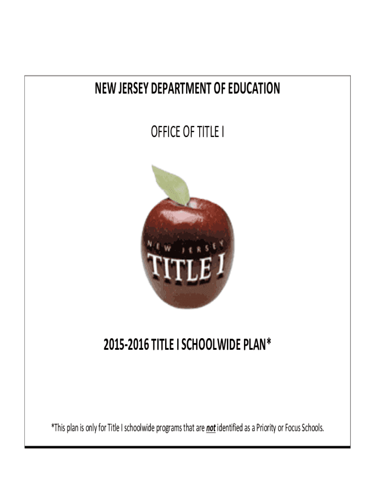 NEWJERSEYDEPARTMENTOFEDUCATION OFFICEOFTITLEI 20152016TITLEISCHOOLWIDEPLAN* *ThisplanisonlyforTitleIschoolwideprogramsthatarenotidentifiedasaPriorityorFocusSchools.SCHOOLWIDESUMMARYINFORMATIONESEA1114DISTRICTINFORMATIONSCHOOL