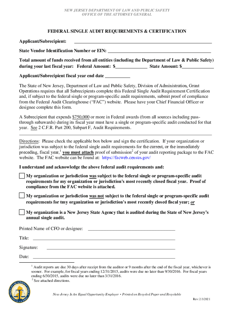 NEW JERSEY DEPARTMENT OF LAW AND PUBLIC SAFETY OFFICE OF THE ATTORNEY GENERALFEDERAL SINGLE AUDIT REQUIREMENTS & CERTIFICATION Applicant/Subrecipient: State Vendor Identification Number or EIN: Total