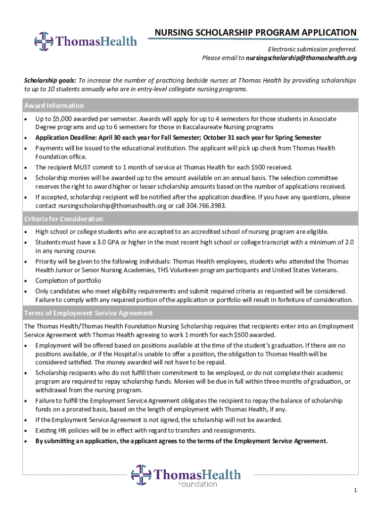 NURSING SCHOLARSHIP PROGRAM APPLICATION Electronic submission preferred. Please email to nursingscholarship@thomashealth.org Scholarship goals: To increase the number of practicing bedside nurses