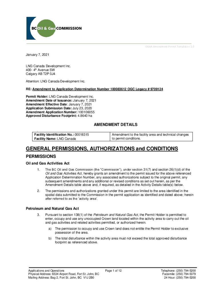 GAA Amendment Permit Template v 1.0January 7, 2021LNG Canada Development Inc. 400 4th Avenue SW Calgary AB T2P 0J4 Attention: LNG Canada Development Inc. RE: Amendment to Application Determination