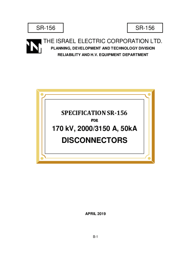 DDdDDSR156SR156THE ISRAEL ELECTRIC CORPORATION LTD. PLANNING, DEVELOPMENT AND TECHNOLOGY DIVISION RELIABILITY AND H.V. EQUIPMENT DEPARTMENTSPECIFICATION SR156 FOR170 KV, 2000/3150 A, 50kADISCONNECTORSAPRIL