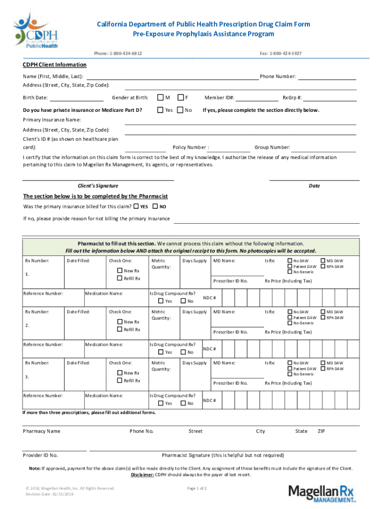 California Department of Public Health Prescription Drug Claim Form Exposure Prophylaxis Assistance Program Phone: 18004246812Fax: 18004245927CDPH Client Information Phone Number:Name (First, Middle,