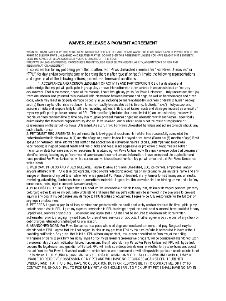 WAIVER, RELEASE & PAYMENT AGREEMENT WARNING...READ CAREFULLY. THIS AGREEMENT INCLUDES A RELEASE OF LIABILITY AND WAIVER OF LEGAL RIGHTS AND DEPRIVES YOU OF THE RIGHT TO SUE FOR PAWS UNLEASHED AND