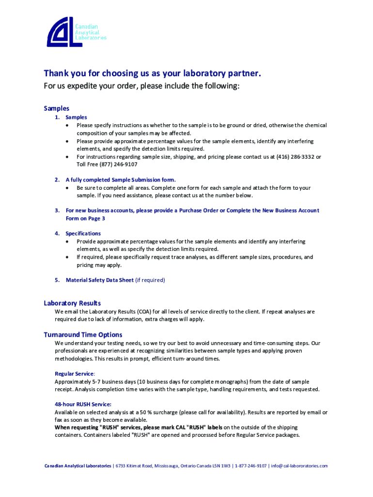 Thank you for choosing us as your laboratory partner. For us expedite your order, please include the following: Samples 1. Samples Please specify instructions as whether to the sample is to be ground
