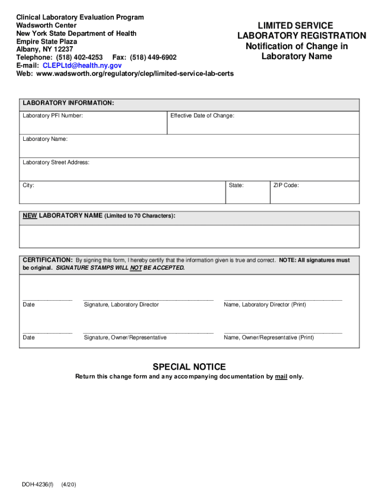 Clinical Laboratory Evaluation Program Wadsworth Center New York State Department of Health Empire State Plaza Albany, NY 12237 Telephone: (518) 4024253 Fax: (518) 4496902 Email: CLEPLtd@health.ny.gov