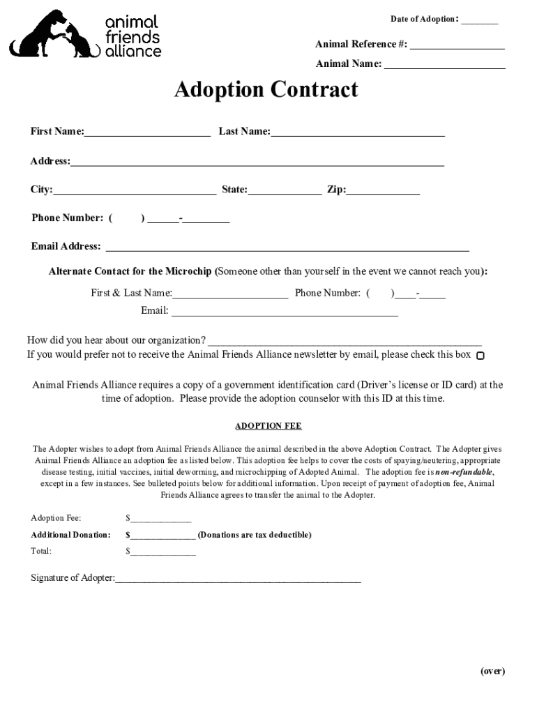 Date of Adoption: Animal Reference #: Animal Name: Adoption Contract First Name: Last Name: Address: City: State: Zip: Phone Number: () Email Address: Alternate Contact for the Microchip (Someone