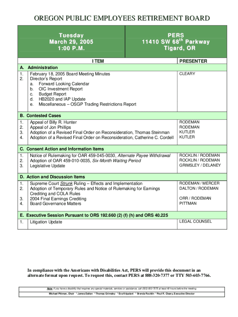 O OR REED BO OA GO AR ON RD N PPU D UP BLL IIC C EEM APOLLO OF PEERESS R REENTER SEEM BEEN NTT B Tuesday, March 29, 2005 1:00 P.M.PEERS 11410 SW 68th Parkway Tigard, ORI TEM A. Administration 1. February