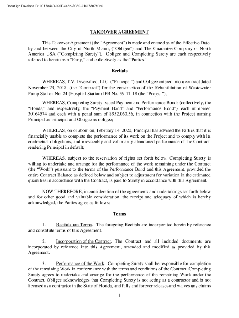 DocuSign Envelope ID: 0E17A44D092E4482AC5C91407A07802CTAKEOVER AGREEMENT