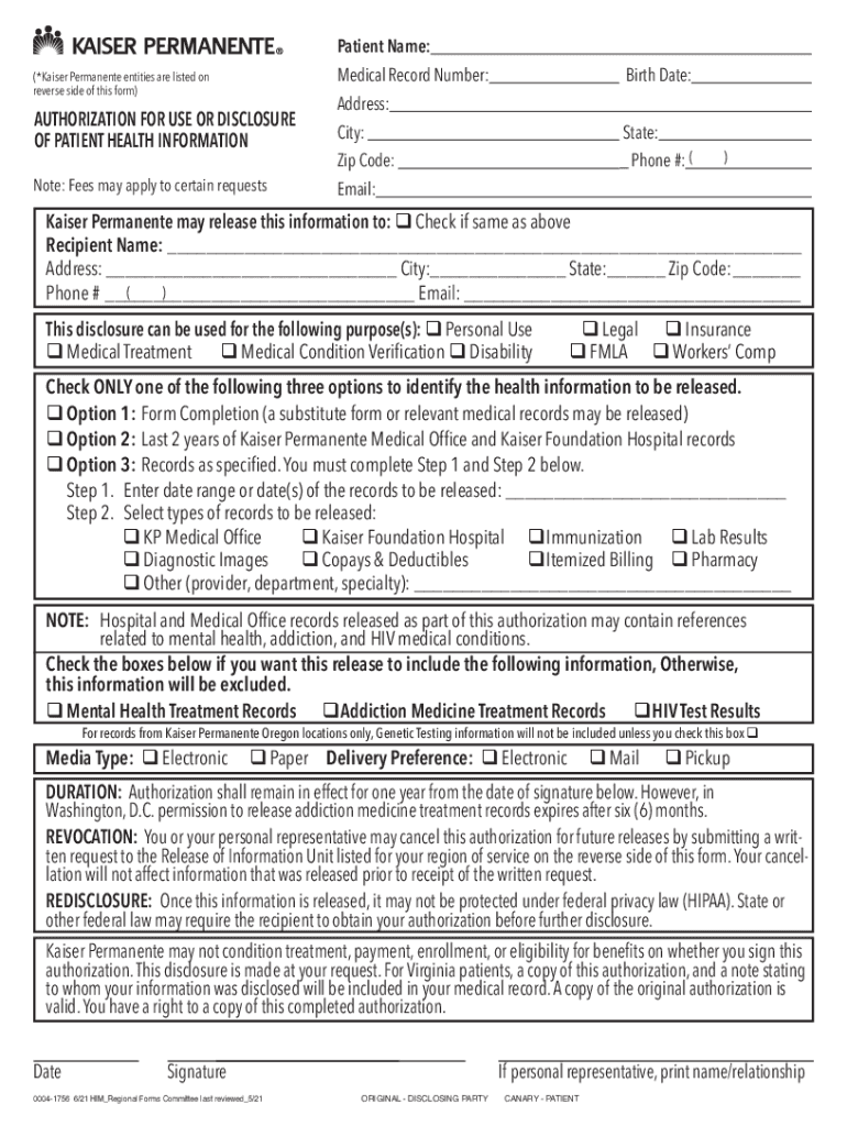Patient Name: Medical Record Number:(*Kaiser Permanent entities are listed on reverse side of this form)AUTHORIZATION FOR USE OR DISCLOSURE OF PATIENT HEALTH INFORMATION Note: Fees may apply to certain