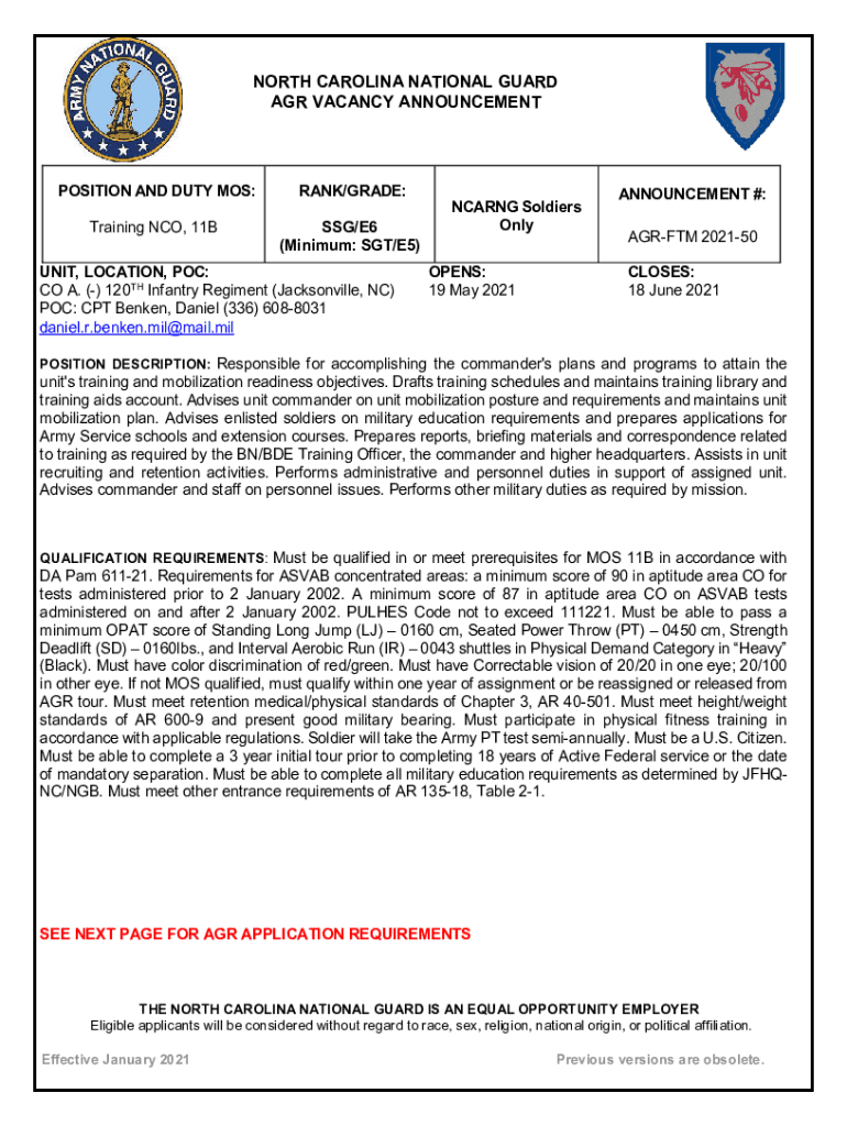 NORTH CAROLINA NATIONAL GUARD AGR VACANCY ANNOUNCEMENTPOSITION AND DUTY MOS:RANK/GRADE:Training NCO, 11BSSG/E6 (Minimum: SGT/E5)UNIT, LOCATION, POC: CO A. () 120TH Infantry Regiment (Jacksonville,