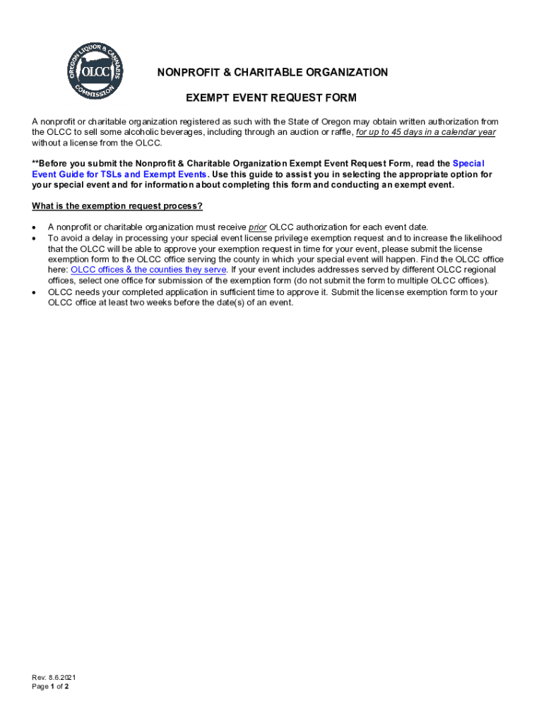 NONPROFIT & CHARITABLE ORGANIZATION EXEMPT EVENT REQUEST From A nonprofit or charitable organization registered as such with the State of Oregon may obtain written authorization from the LCC to sell
