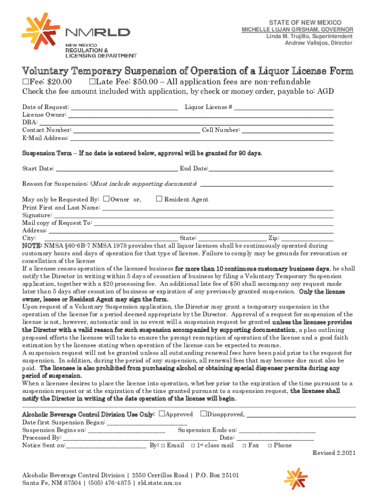 STATE OF NEW MEXICO MICHELLE LUJAN GRISHAM, GOVERNOR Linda M. Trujillo, Superintendent Andrew Vallejo, DirectorVoluntary Temporary Suspension of Operation of a Liquor License Form Fee: $20.00Late