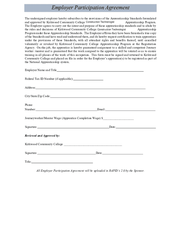 Employer Participation Agreement The undersigned employer hereby subscribes to the provisions of the Apprenticeship Standards formulated Construction Technologist and approved by Kirkwood Community