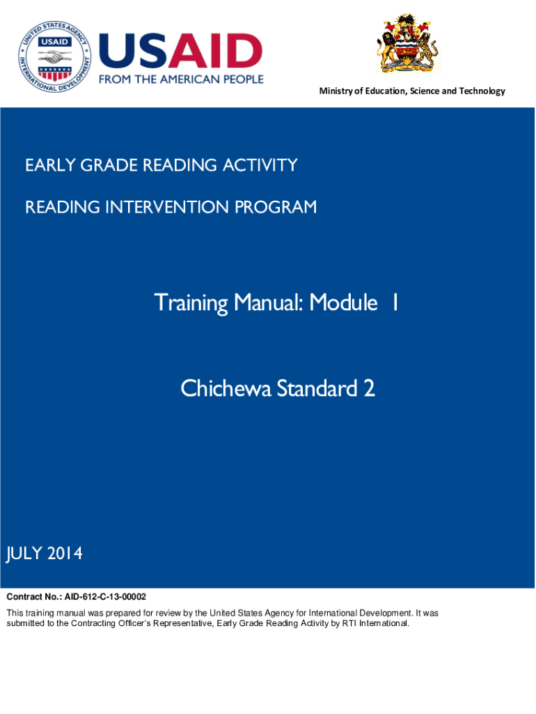 Ministry of Education, Science and Technologically GRADE READING ACTIVITY READING INTERVENTION PROGRAMTraining Manual: Module 1 Chichewa Standard 2JULY 2014 Contract No.: AID612C1300002 This training