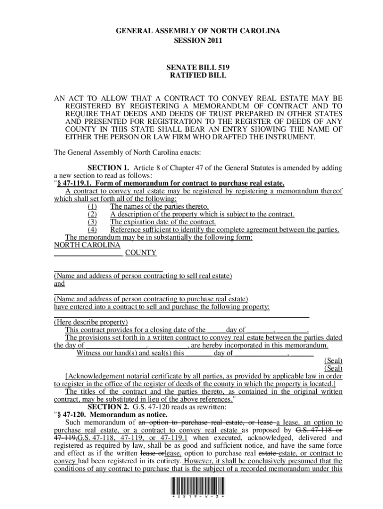 GENERAL ASSEMBLY OF NORTH CAROLINA SESSION 2011SENATE BILL 519 RATIFIED BILL AN ACT TO ALLOW THAT A CONTRACT TO CONVEY REAL ESTATE MAY BE REGISTERED BY REGISTERING A MEMORANDUM OF CONTRACT AND TO