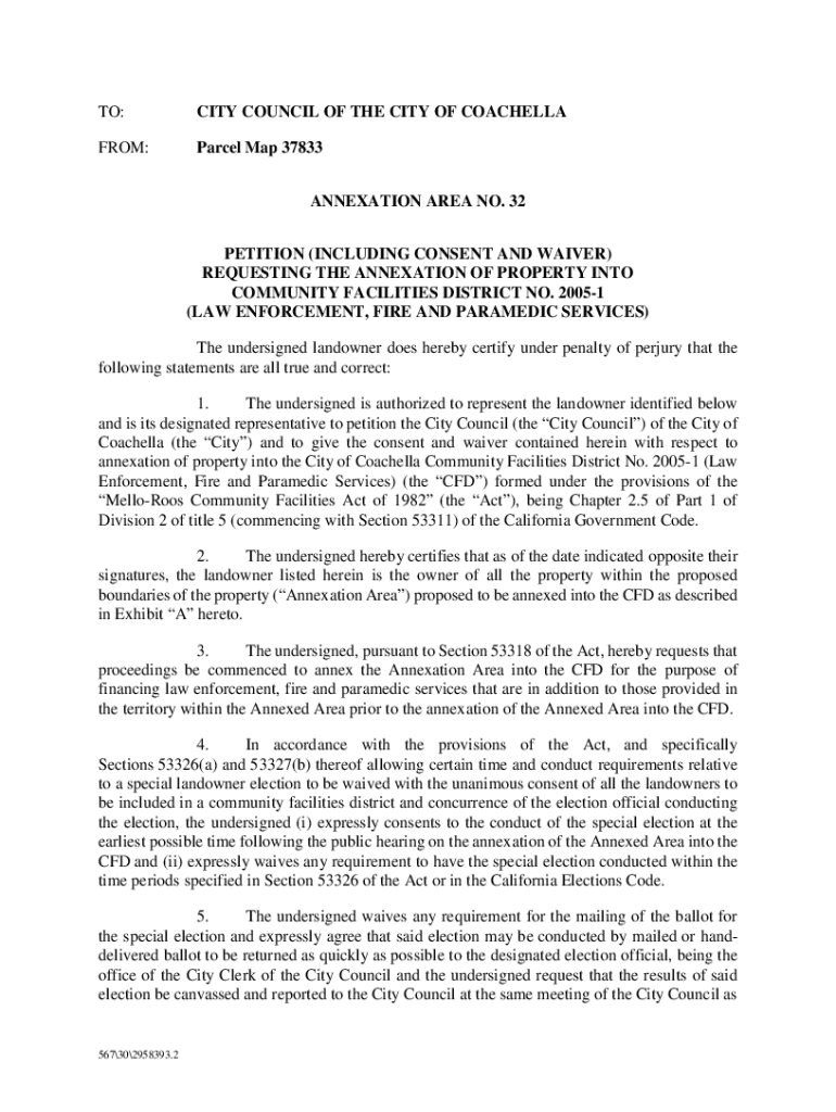 TO:CITY COUNCIL OF THE CITY OF COACHELLAFROM:Parcel Map 37833 ANNEXATION AREA NO. 32 PETITION (INCLUDING CONSENT AND WAIVER) REQUESTING THE ANNEXATION OF PROPERTY INTO COMMUNITY FACILITIES DISTRICT