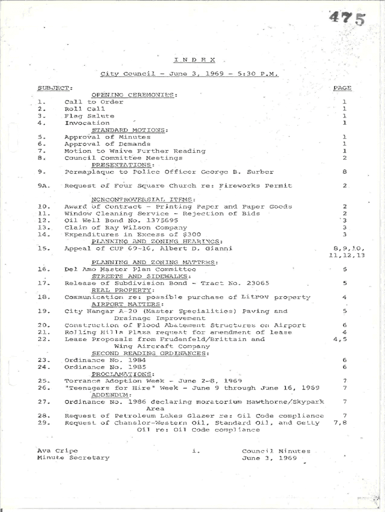 , I.ND EX City Council June 3, 19695:30 P.M.SUBJECT:PAGE9.OPENING CEREMONIES: Call to Order Roll Call Flag Salute Invocation / STANDARD MOTIONS: Approval of Minutes Approval of Demands Motion to Waive