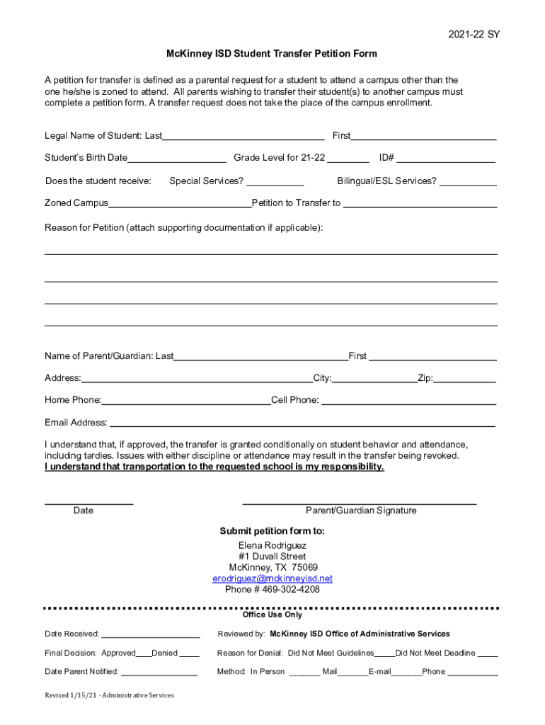 202122 SY McKinney ISD Student Transfer Petition Form A petition for transfer is defined as a parental request for a student to attend a campus other than the one he/she is zoned to attend. All parents