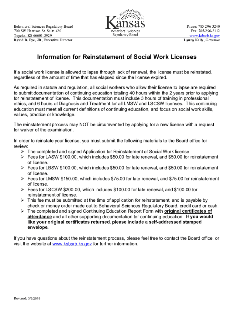 Behavioral Sciences Regulatory Board 700 SW Harrison St. Suite 420 Topeka, KS 666033929 David B. FYE, JD, Executive DirectorPhone: 7852963240 Fax: 7852963112 www.ksbsrb.ks.gov Laura Kelly, GovernorInformation