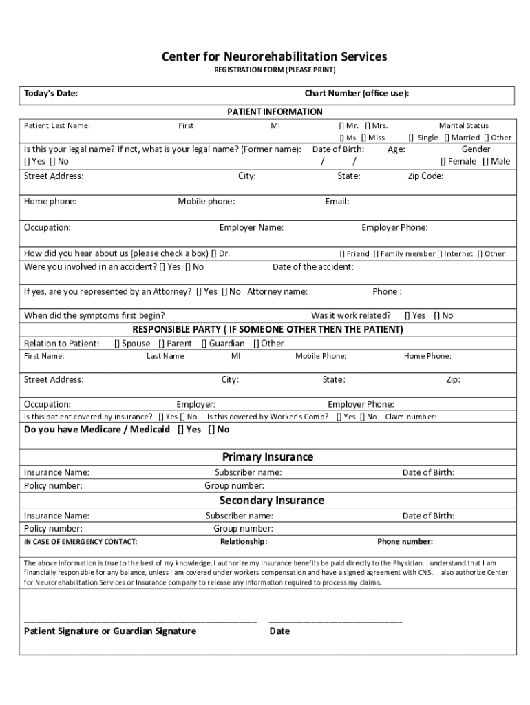 Center for Neurorehabilitation Services REGISTRATION FORM (PLEASE PRINT)Today's Date:Chart Number (office use): PATIENT INFORMATIONPatient Last Name:First:MI Mr. Mrs. Ms. Misses this your legal name?