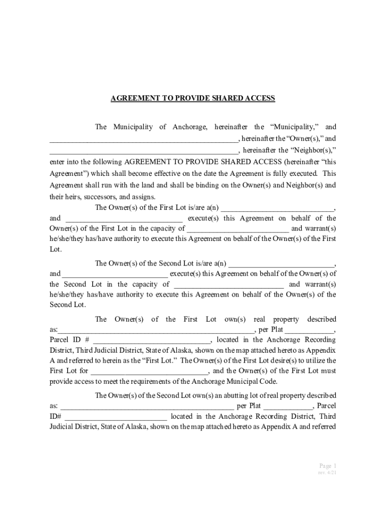 AGREEMENT TO PROVIDE SHARED Access Municipality of Anchorage, hereinafter the Municipality, and, hereinafter the Owner(s), and, hereinafter the Neighbor(s), enter into the following AGREEMENT TO PROVIDE