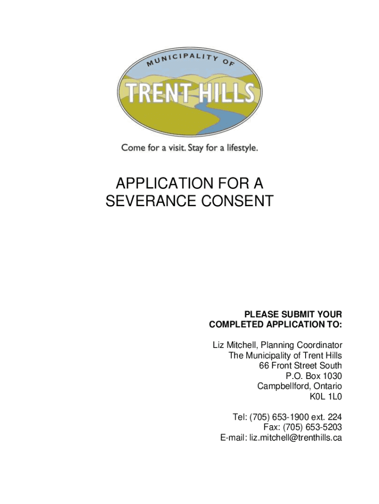 APPLICATION FOR A SEVERANCE CONSENTPLEASE SUBMIT YOUR COMPLETED APPLICATION TO: Liz Mitchell, Planning Coordinator The Municipality of Trent Hills 66 Front Street South P.O. Box 1030 Campbell ford,