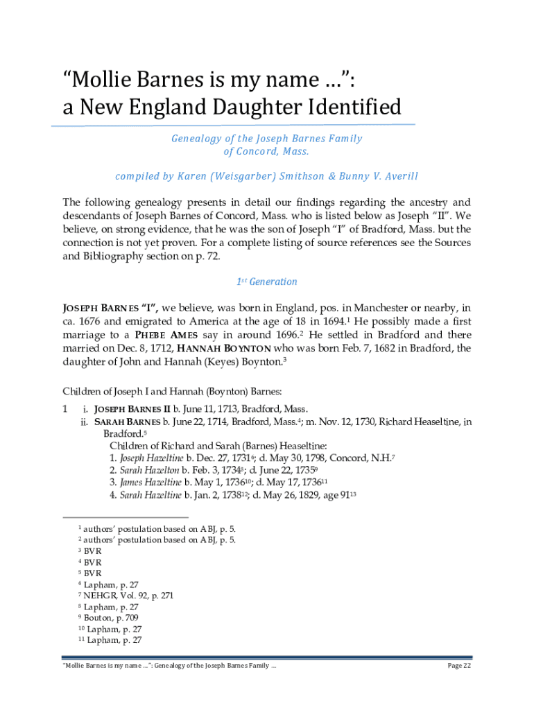 Mollie Barnes is my name : a New England Daughter Identified Genealogy of the Joseph Barnes Family of Concord, Mass. compiled by Karen (Wayfarer) Smithson & Bunny V. Ave rill The following genealogy