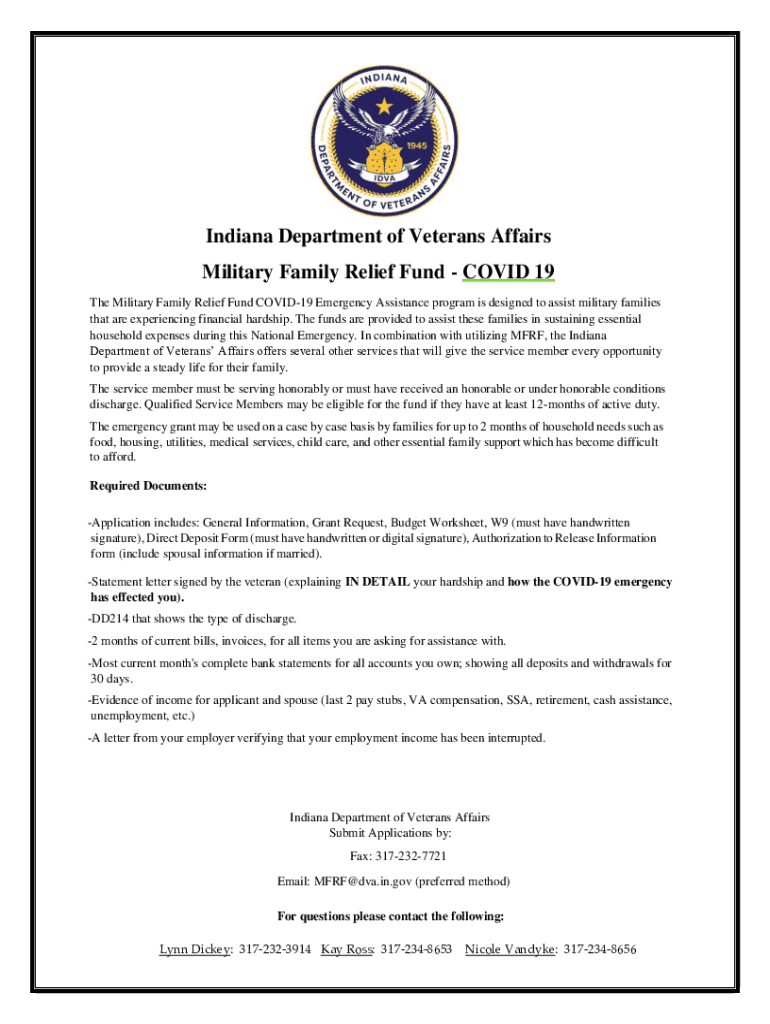 Indiana Department of Veterans Affairs Military Family Relief Fund COVID-19 The Military Family Relief Fund COVID-19 Emergency Assistance program is designed to assist military families that are experiencing