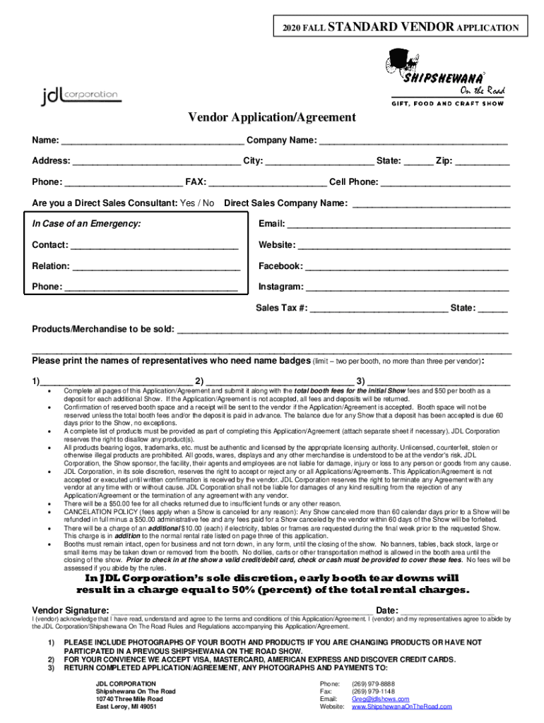 2020 FALL STANDARDVENDOR APPLICATIONVendor Application/Agreement Name: Company Name: Address: City: State: Zip: Phone: FAX: Cell Phone: Are you a Direct Sales Consultant: Yes / Direct Sales Company