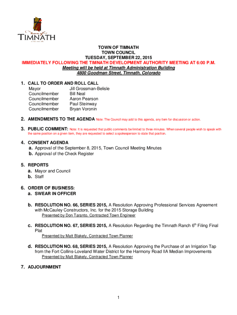 Get the free TOWN OF TIMNATH TOWN COUNCIL Tuesday, October 27, 2015, at ...