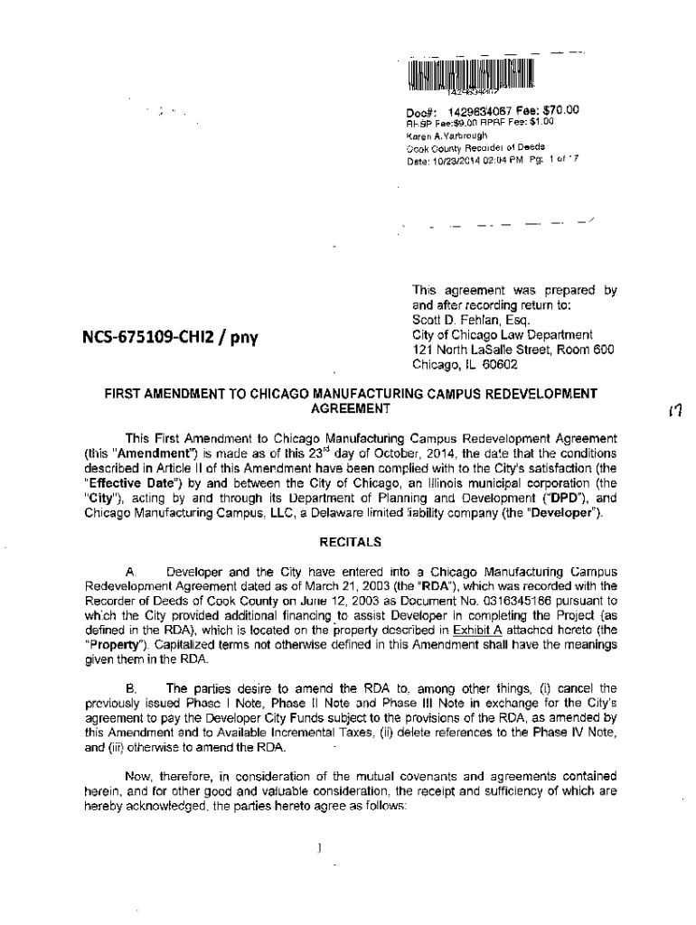 ' Doc#:142963 '4067 Fee: $70.00RHSP Fee:$9.00 RPF Fee: $1.00Karen A. Yarbrough Cook County Recorder of Deeds Date: 10/23/2014 02:04 PM Pg: 1 of 17NCS675109CHI2This agreement was prepared by and after