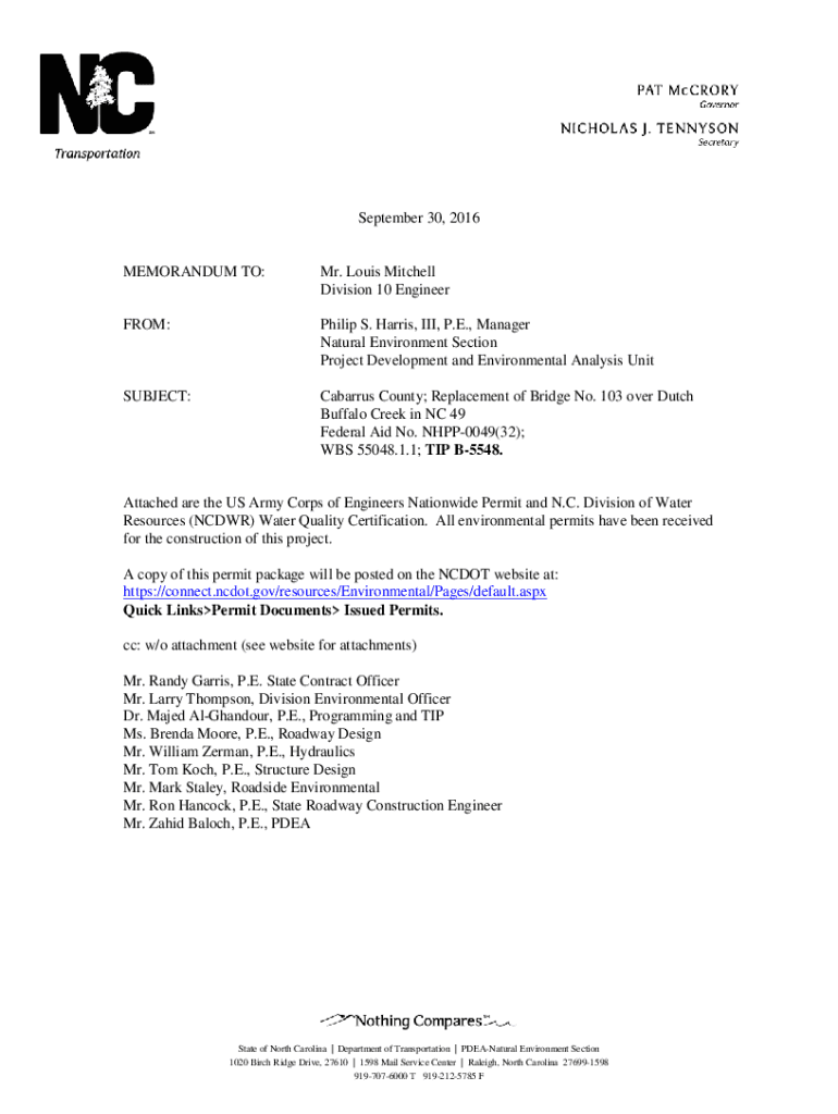 September 30, 2016MEMORANDUM TO:Mr. Louis Mitchell Division 10 EngineerFROM:Philip S. Harris, III, P.E., Manager Natural Environment Section Project Development and Environmental Analysis UnitSUBJECT:Cabarets
