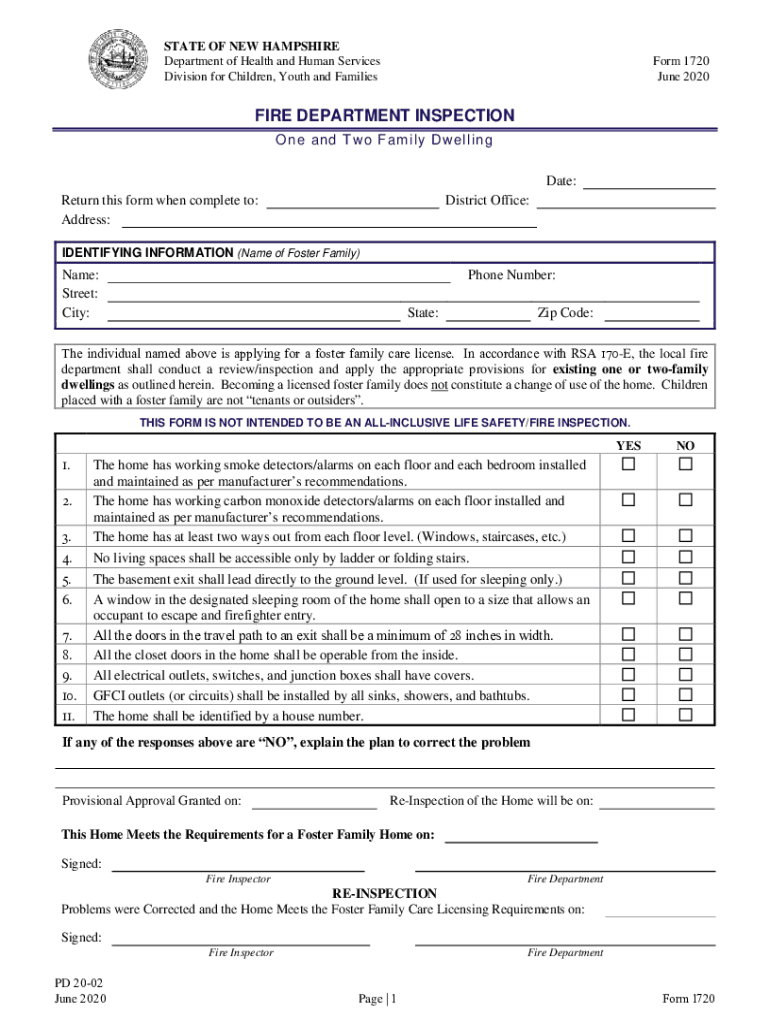 STATE OF NEW HAMPSHIRE Department of Health and Human Services Division for Children, Youth and FamiliesForm 1720 June 2020FIRE DEPARTMENT INSPECTION One and Two Family Dwelling Date: Return this