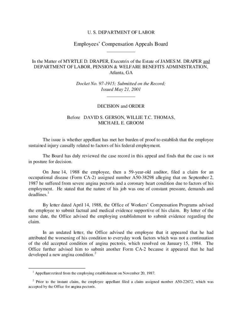 U. S. DEPARTMENT OF LABOREmployees Compensation Appeals Board In the Matter of MYRTLE D. DRAPER, Executrix of the Estate of JAMES M. DRAPER and DEPARTMENT OF LABOR, PENSION & WELFARE BENEFITS ADMINISTRATION,