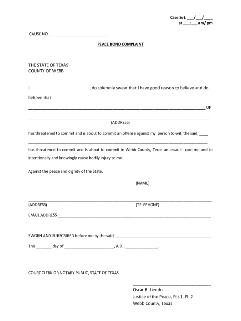 CAUSE NO. Case Set: / / at : am/pm PEACEBONDCOMPLAINT THESTATEOFTEXAS COUNTYOFWEBB I, dosolemnlyswearthatIhavegoodreasontobelieveanddo believe that OF. (ADDRESS) hasthreatenedtocommitandisabouttocommitanoffenseagainstmypersontowit,