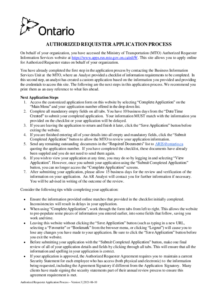 AUTHORIZED REQUESTER APPLICATION PROCESS On behalf of your organization, you have accessed the Ministry of Transportation (MTO) Authorized Requester Information Services website at https://www.apps.rus.mto.gov.on.ca/edtW.