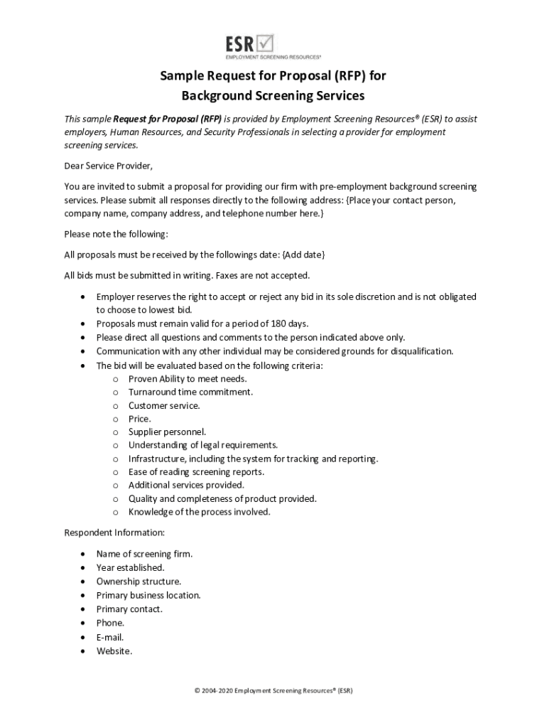 Sample Request for Proposal (RFP) for Background Screening Services This sample Request for Proposal (RFP) is provided by Employment Screening Resources (ESR) to assist employers, Human Resources,