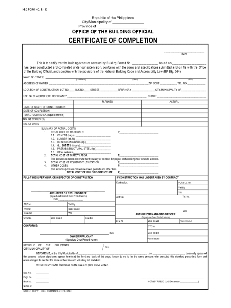 NBC FORM NO. B 10Republic of the Philippines City/Municipality of Province of OFFICE OF THE BUILDING OFFICIALCERTIFICATE OF COMPLETION Dates is to certify that the building/structure covered by Building