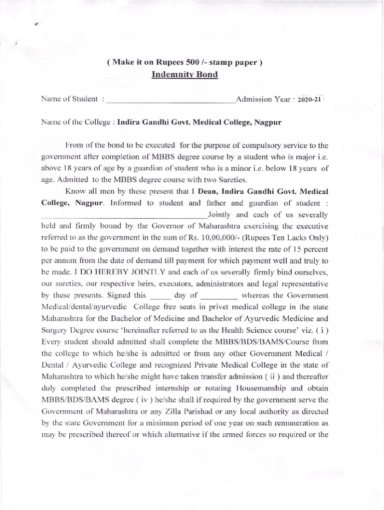 Name of StudentAdmission Year ::Name of the College :2o2o21lndira Gandhi Govt. Medical College, NagpurFrom of the bond to be executed for the purpose