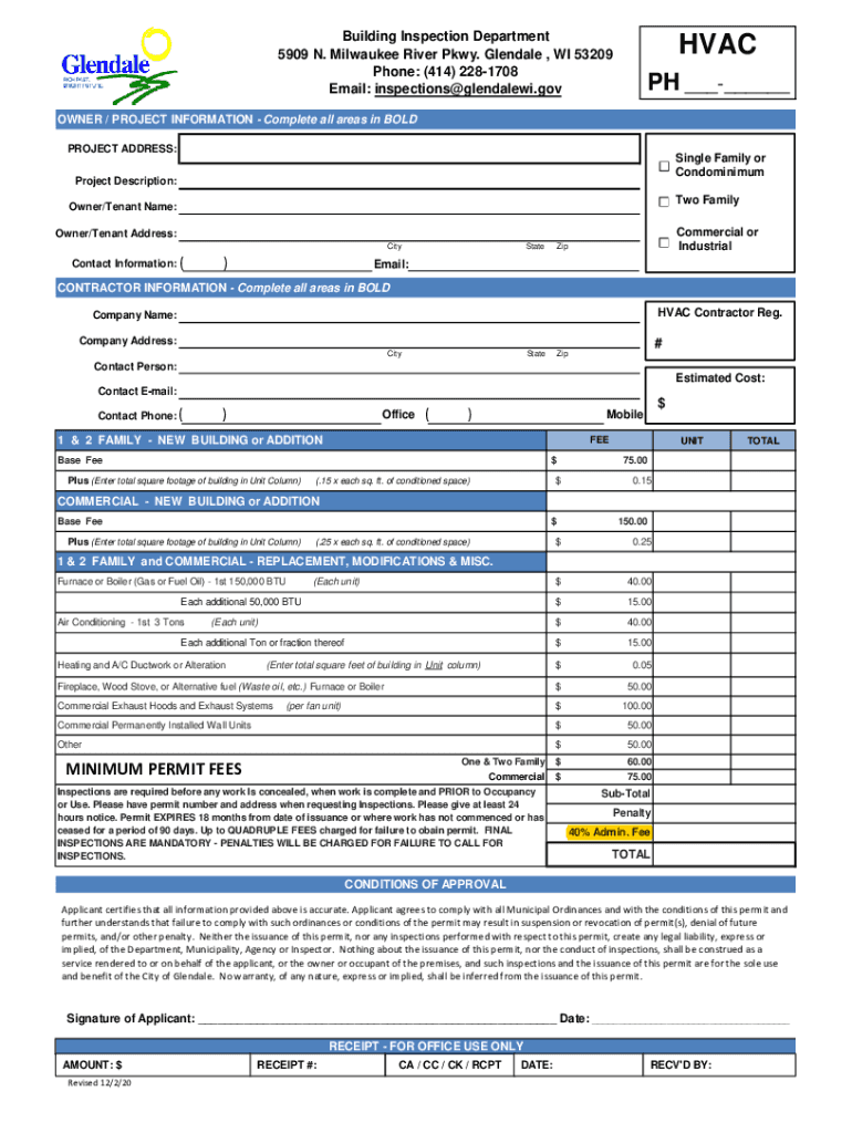 Building Inspection Department 5909 N. Milwaukee River Pkwy. Glendale, WI 53209 Phone: (414) 2281708 Email: inspections Glendale. Gothic PH OWNER / PROJECT INFORMATION Complete all areas in BOLD PROJECT