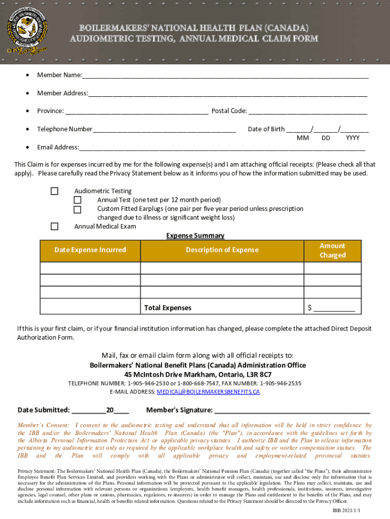 BOILERMAKERS NATIONAL HEALTH PLAN (CANADA) AUDIOMETRIC TESTING, ANNUAL MEDICAL CLAIM FORMMemberName: MemberAddress: Province: Postcode: TelephoneNumber DateofBirth / / MMDDYYYY Misaddress: ThisClaimisforexpensesincurredbymeforthefollowingexpense(s)andIamattachingofficialreceipts:(Pleasecheckallthat