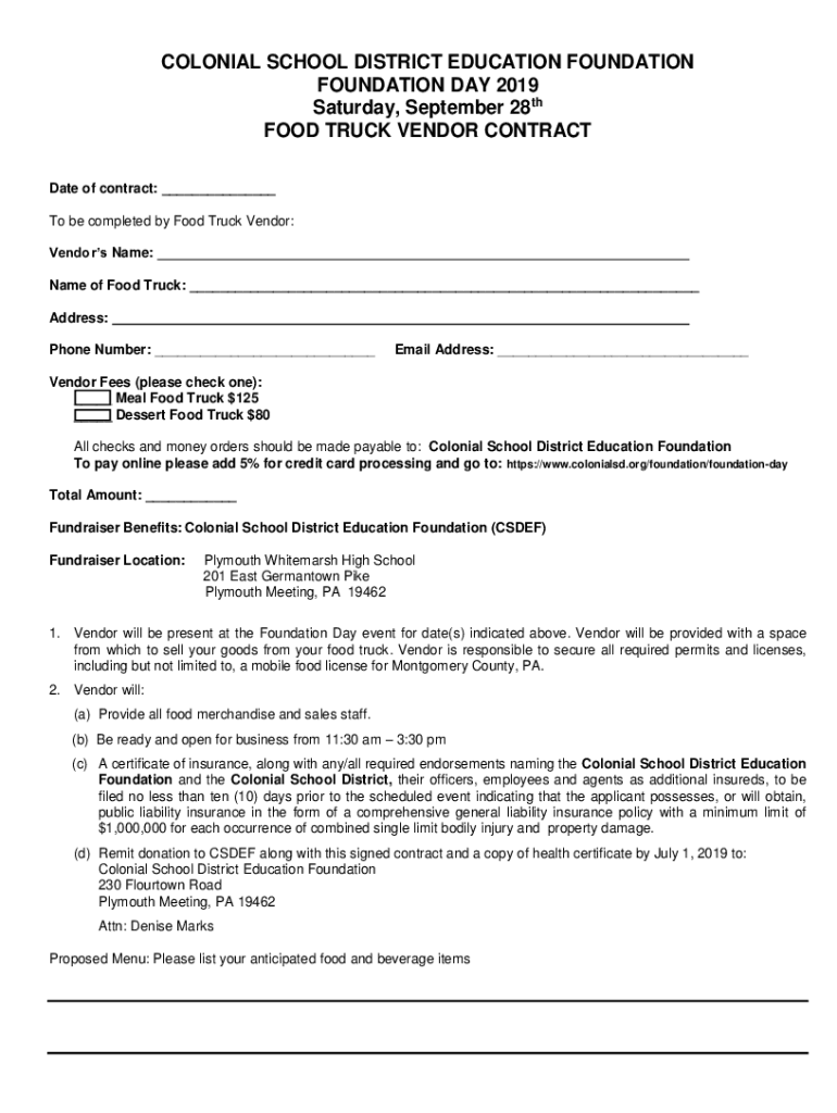 COLONIAL SCHOOL DISTRICT EDUCATION FOUNDATION DAY 2019 Saturday, September 28th FOOD TRUCK VENDOR CONTRACT Date of contract: To be completed by Food Truck Vendor: Vendors Name: Name of Food Truck: