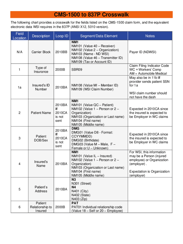 Get the free CMS-1500 to 837P Crosswalk - workforcesafety.com
