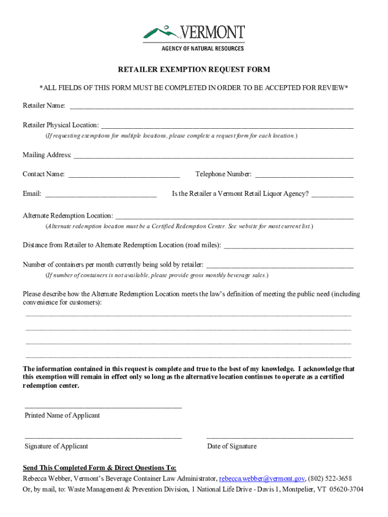 RETAILER EXEMPTION REQUEST FORM *ALL FIELDS OF THIS FORM MUST BE COMPLETED IN ORDER TO BE ACCEPTED FOR REVIEW* Retailer Name: Retailer Physical Location: (If requesting exemptions for multiple locations,