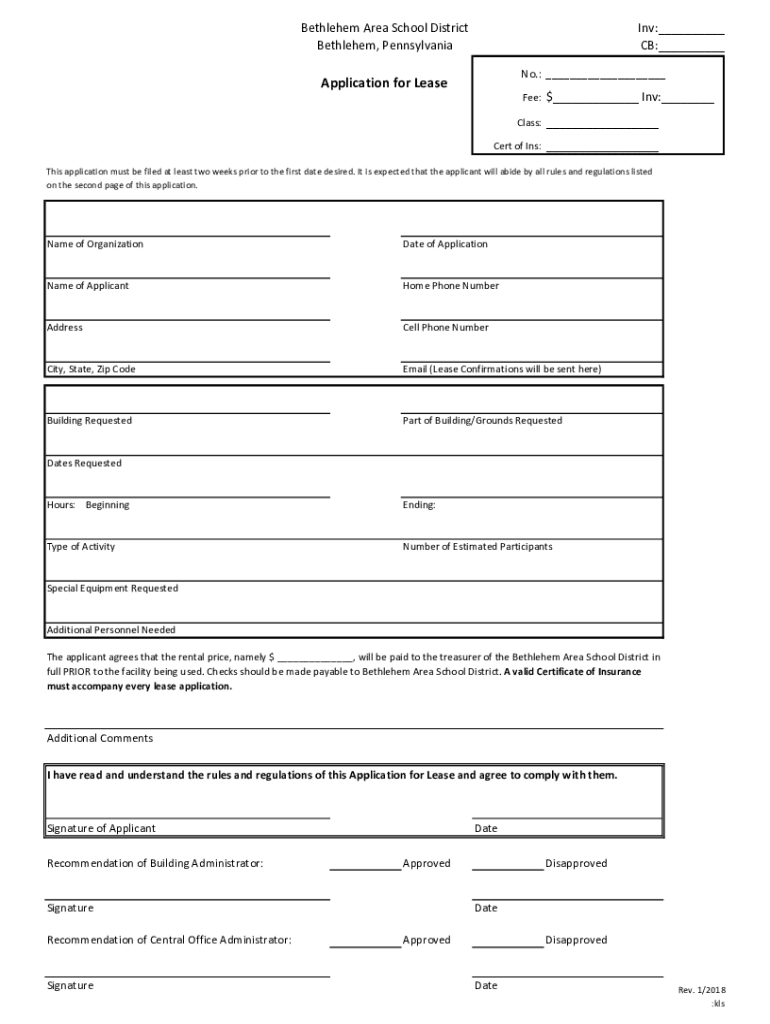 BethlehemAreaSchoolDistrict Bethlehem, Pennsylvanian: CB: No.: ApplicationforLeaseFee:$ In: Class: Certifies: Thisapplicationmustbefiledatleasttwoweekspriortothefirstdatedesired. Itisexpectedthattheapplicantwillabidebyallrulesandregulationslisted