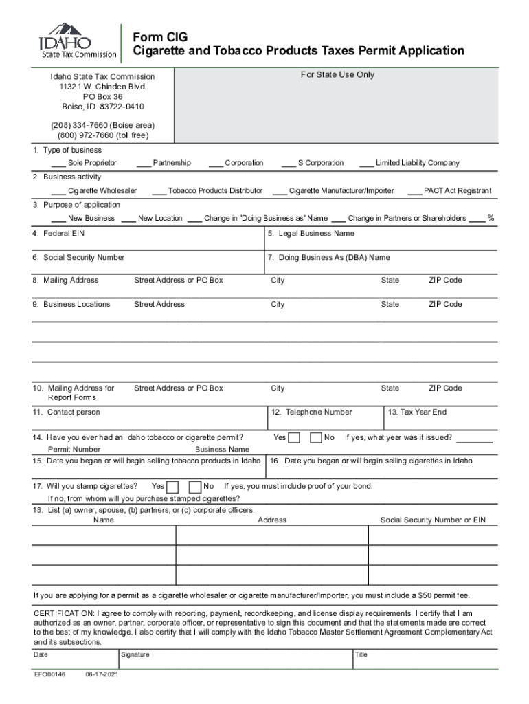 Form CIG Cigarette and Tobacco Products Taxes Permit Application For State Use Only Idaho State Tax Commission 11321 W. Chin den Blvd. PO Box 36 Boise, ID 837220410 (208) 3347660 (Boise area) (800)