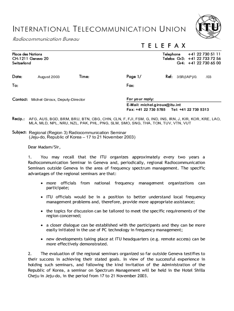 I INTERNATIONAL T TELECOMMUNICATION UN ION Radio communication Bureau E L E F A Place DES Nations CH1211 Geneva 20 SwitzerlandDate:August 2003Telephone +41 22 730 51 11 Telefax Gr3: +41 22 733 72