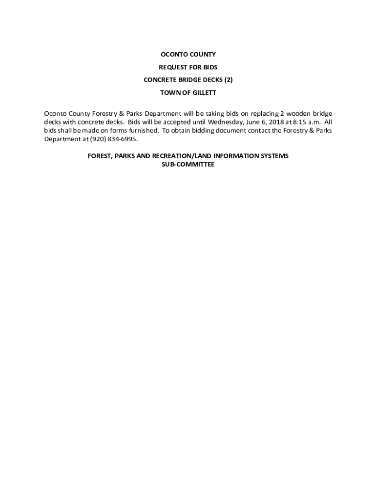 ONTO COUNTY REQUEST FOR BIDS CONCRETE BRIDGE DECKS (2) TOWN OF GILLETT Onto County Forestry & Parks Department will be taking bids on replacing 2 wooden bridge decks with concrete decks. Bids will